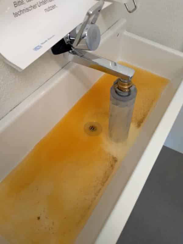 starke dunkelbraune bis rotbraune Trübung, Austrag von Partikeln während der Reinigung